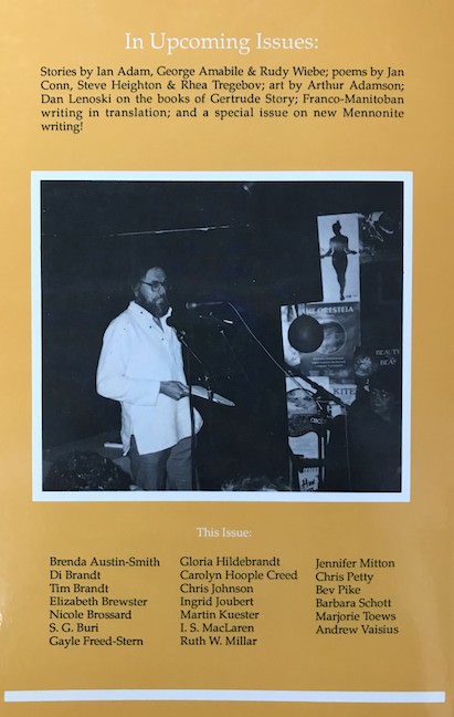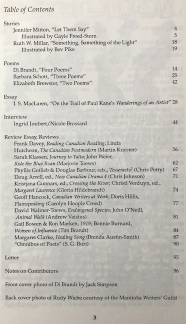 Interview with Nicole Brossard, fiction by Jennifer Mitton & Ruth W. Millar, poems by Di Brandt, Elizabeth Brewster, Barbara Schott & more!
