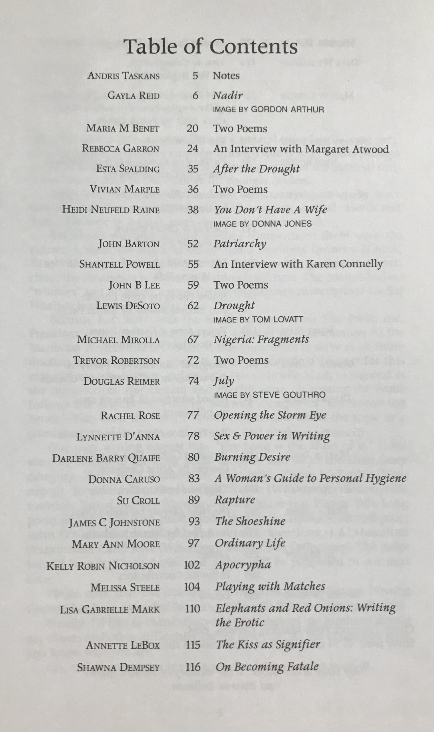 Interviews with Margaret Atwood and Karen Connelly, finalists of “Hot Shorts: Erotica without exploitation” & more!