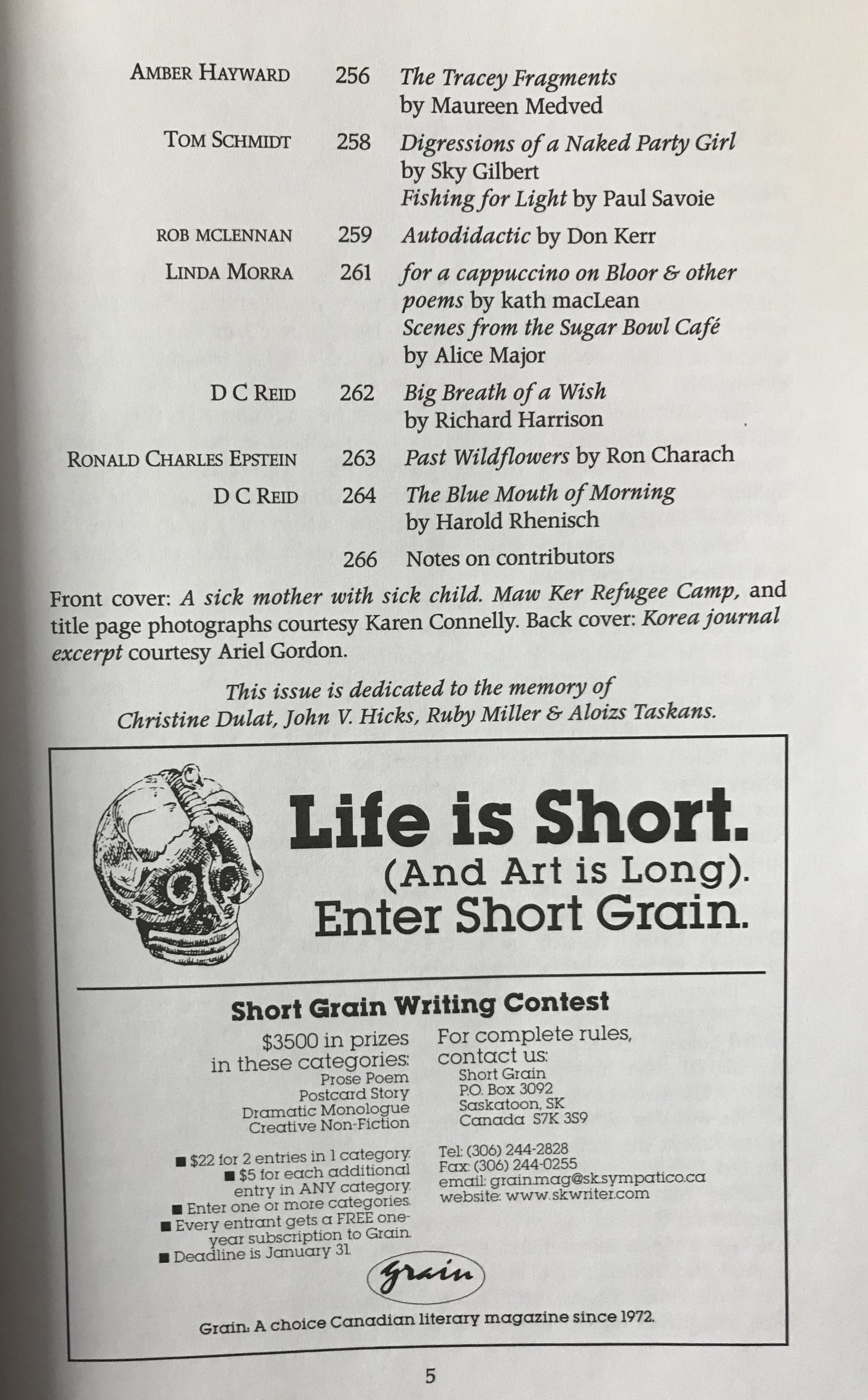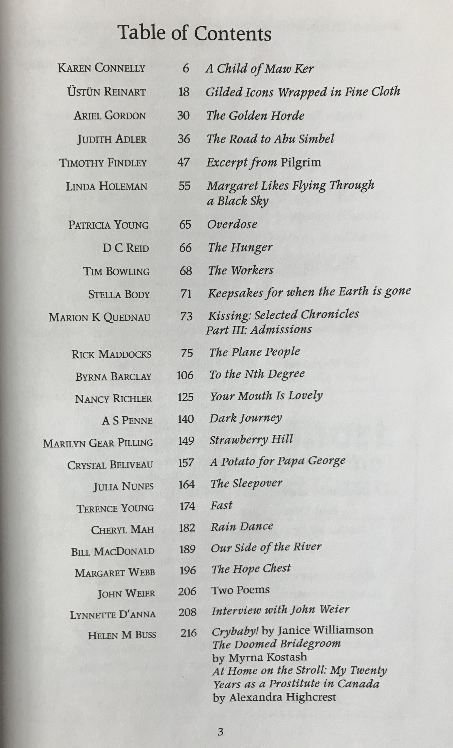 This issue features “Canadian Women’s Stories From Overseas,” as well as the 1998 writing contest winners. Featuring writing from Patricia Young, Tim Bowling, John Weier & more!