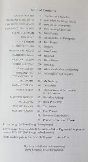 This issue includes poetry by the late Marvin Francis, fiction by Catherine Egan, and non-fiction by Charlene Diehl-Jones.