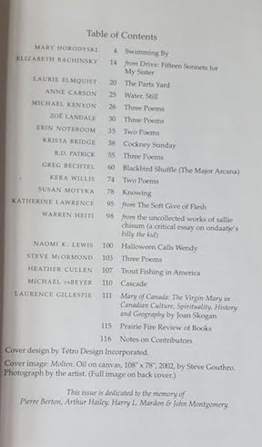 This issue includes poetry by Anne Carson and Elizabeth Bachinsky, and fiction by Mary Horodyski and Greg Bechtel.