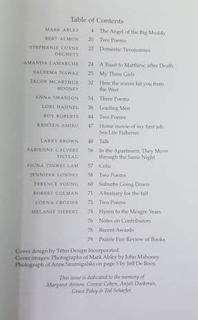 The highlight of this issue is Mark Abley’s 2006 Anne Szumigalski Memorial Lecture, “The Angel of the Big Muddy.” The issue includes poetry by Lorna Crozier and Bert Almon, and a story by Saleema Nawaz that went on to win the Journey Prize.