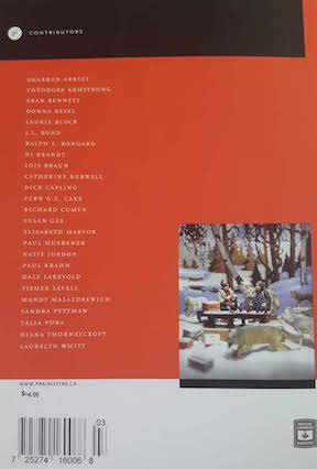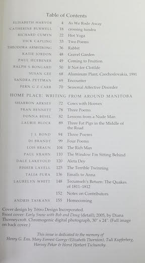 The feature section of this issue is titled “Home Place: Writing from around Manitoba,” with new work by Di Brandt, Lois Braun and Laurie Block. The issue also contains fiction by Théodora Armstrong, Richard Cumyn and Elisabeth Harvor, among others.