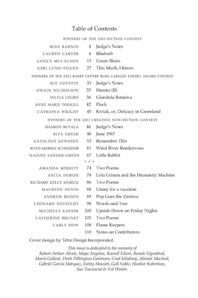 This issue features the winning entries of the 2013 writing contests, along with judges’ comments.