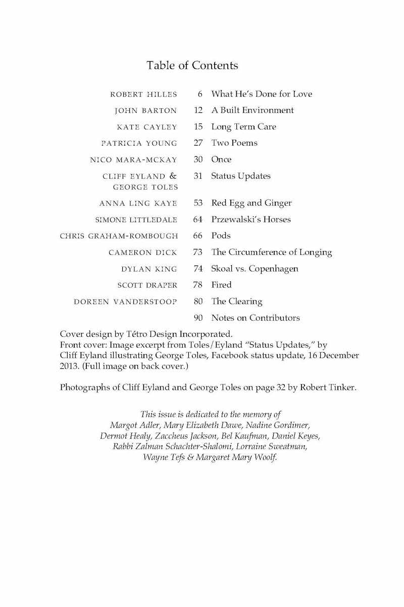 This issue features a 16-page colour insert of the collaborative “Status Updates” by Cliff Eyland (art) and George Toles (text), along with wonderful fiction & poetry – six of each!