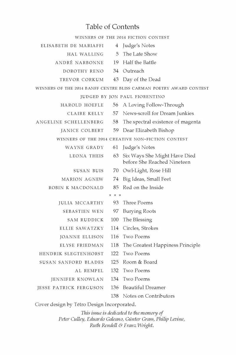 This issue features the winning entries of the 2014 writing contests, along with judges’ comments and a wonderful selection of regularly submitted fiction and poetry.