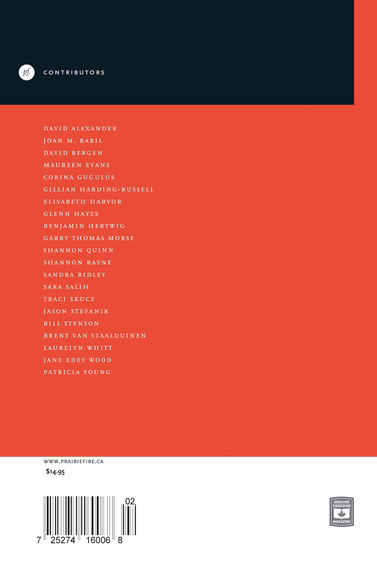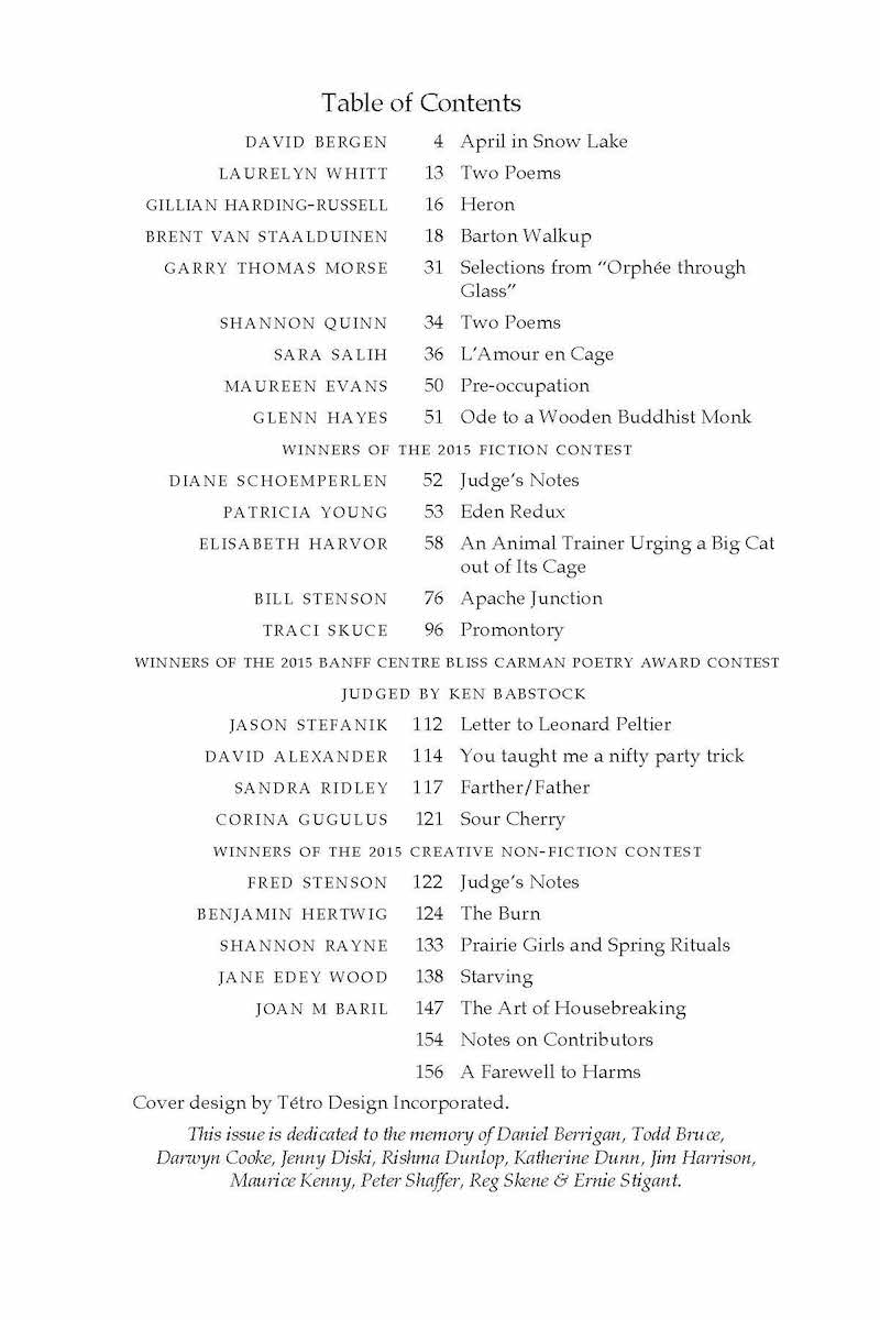 This issue features winners of the 2015 writing contests and includes a new story by David Bergen.